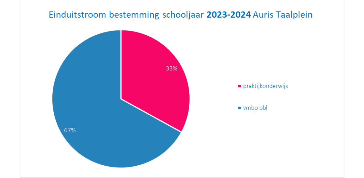 De schoolnorm van Auris Taalplein is 80% uitstroom VMBO.  Het schooljaar 2023-2024 is deze norm niet behaald. Wij kunnen dit verklaren door de latere instroom van leerlingen en het was een kleine groep waardoor de cijfers niet representatief zijn.