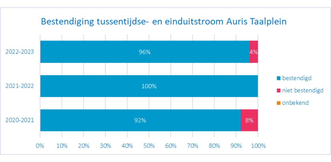 Auris streeft naar 90% bestendiging. Auris Taalplein heeft deze ambitie behaald met 96%.